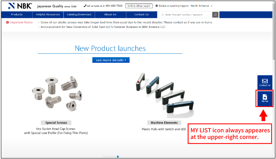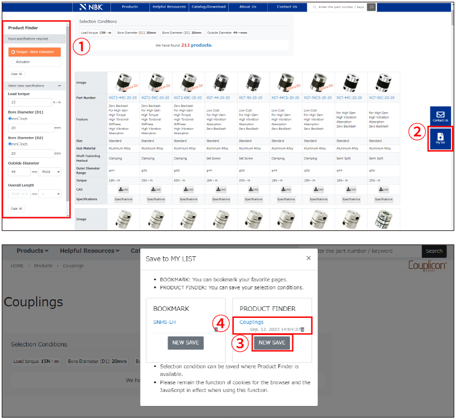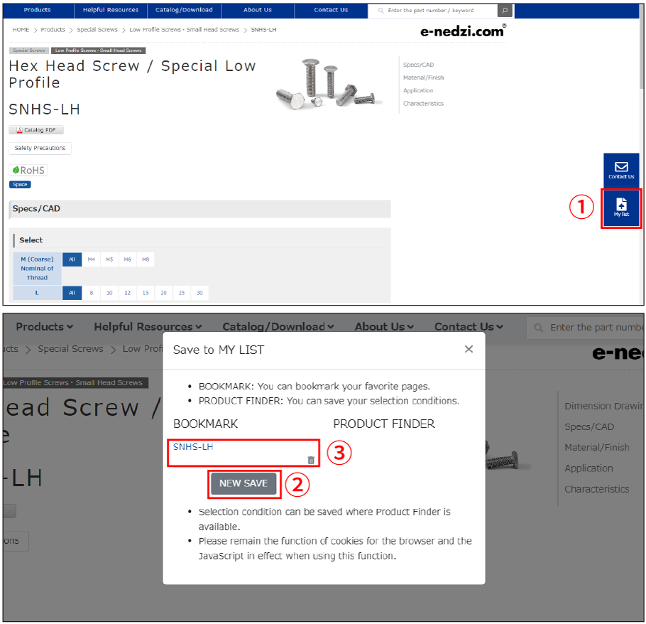 ①Input specifications required and click the submit button. ②Atfer you get the result, click MY LIST icon. ③Click NEW SAVE button. ④You can move to the result pages from MY LIST instantly. ※Selection condition can be saved where Product Finder is available.