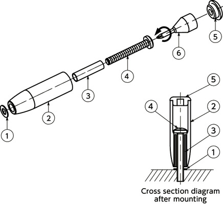 Insert the spacer ③ and bolt ④ into the grip mainbody ②, set the disc spring ① to the mountingsurface (refer to the cross section diagram aftermounting), and tighten the bolt ④ with ascrewdriver ⑥. Then, check the tightening and therotation of the grip main body, and insert the cap⑤ into the grip main body.